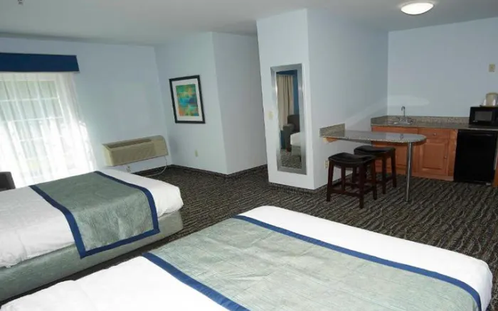 Standard Rooms - 2 Double Our cozy Standard Rooms include 2 Double beds, a desk with a chair, a single sofa chair, a cable TV, a microwave, a mini fridge and more. These rooms are pet friendly.*Standard Rooms - 1 King Our cozy Standard Rooms include 1 King bed, a desk with a chair, a single sofa chair, a cable TV, a microwave, a mini fridge and more. These rooms are pet friendly.*Efficiency Room with 2 Double Beds Efficiency Room with 2 Double BedsExterior kitchen room, 2 separate rooms, living room with pull-out sofa bed, Flat-screen TV (cable), telephone, table with chair, kitchen with stove & full-size fridge. No pots, pans, dishes or cutlery. Bedroom with 2 double beds, air conditioning, Flat-screen TV(cable) and bathroom with a slopped ceiling. Note: Some of the rooms may not have a seperate room and a sofa bed. (Subject to availability). These rooms are pet friendly.Efficiency Room with 1 King Bed Exterior kitchen room,1 King bed, a work desk with a chair, Flat-screen TV (cable), telephone, table with chair, kitchen with stove & full-size fridge. No pots, pans, dishes or cutlery. These rooms are pet friendly.*One Room Suite with 2 Queen Beds This comfortable One-Bedroom Suite offers two Queen-size beds in an oversized room alongside a kitchenette with a microwave and a small fridge (no stove), countertop with stools, desk and chair, single sofa chair, a cable TV, and more.One Room Suite with 1 King Bed This comfortable One-Bedroom Suite offers one King-size bed in an oversized room alongside a kitchenette with a microwave and a small fridge (no stove), a table and chairs, a cable TV and more.Accessible Suite with 2 Queen Beds Accessible Suite offers two Queen-size beds in an oversized room alongside a kitchenette with a microwave and a small fridge (no stove), countertop with stools, desk and chair, single sofa chair, a cable TV, and more.Accessible Suite with 1 King Bed Accessible Suite offers 1 king size beds in an oversized room alongside a kitchenette with a microwave and a small fridge (no stove), countertop with stools, desk and chair, single sofa chair, a cable TV, and more.Deluxe Suite with 2 Queen Beds Deluxe Suite with 2 Queen BedsThis spacious two-room Deluxe Suite has a bedroom with two Queen-size beds, a telephone, iron and ironing board, and a cable TV. The separate living room features a sitting area, a pull-out sofa, small coffee table, a large cable TV, desk and chair, a kitchenette with countertop with stools, a microwave and small fridge (no stove) and more.Deluxe Suite with 1 King Bed This spacious two-room Deluxe Suite has a bedroom with one King-size bed, a telephone, iron and ironing board, and a cable TV. The separate living room features a pull-out sofa, small coffee table, a large cable TV, desk and chair, a kitchenette with countertop with stools, a microwave and small fridge (no stove) and more.Poolside Deluxe Suite with 1 King Bed This spacious two-room Poolside King Suite has a bedroom with one King-size bed, a telephone, iron and ironing board, and a cable TV. The separate living room features a pull-out sofa, small coffee table, a large cable TV, desk and chair, a kitchenette with countertop with stools, a microwave and small fridge (no stove) and more.Poolside Deluxe Suite with 2 Queen This spacious two-room Poolside Deluxe Suite has a bedroom with two queen beds, a telephone, iron and ironing board, and a cable TV. The separate living room features a pull-out sofa, small coffee table, a large cable TV, desk and chair, a kitchenette with countertop with stools, a microwave and small fridge (no stove) and more.Poolside Accessible Suite - 2 Queen Poolside Accessible Suite offers 2 Queen-size beds in an oversized room alongside a kitchenette with a microwave and a small fridge (no stove), countertop with stools, desk and chair, single sofa chair, a cable TV, and more.Apartment with Full Kitchen Apartment with Full KitchenApartment Suite offers one King-size bedroom, a telephone, iron and ironing board, and a cable TV. The separate living room features a sitting area, a pull-out sofa bed, a large cable TV, table and chairs, a full size kitchen with a microwave, fridge and more. No pots, pans, dishes or cutlery.Jetted Tub Suite with 1 King Bed Jetted Tub Suite with 1 King BedOur charming and oversized Jetted Tub Suites include one king bed with an end of bed bench, a private balcony overlooking the indoor pool, a cable TV, a table and chairs, a kitchenette with a microwave and small fridge (no stove), and a private bathroom. A separate room features a private Jetted Tub and another cable TV.