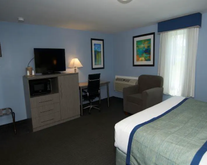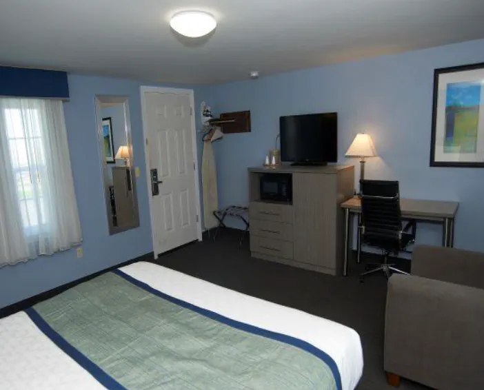 Standard Rooms - 2 Double Our cozy Standard Rooms include 2 Double beds, a desk with a chair, a single sofa chair, a cable TV, a microwave, a mini fridge and more. These rooms are pet friendly.*Standard Rooms - 1 King Our cozy Standard Rooms include 1 King bed, a desk with a chair, a single sofa chair, a cable TV, a microwave, a mini fridge and more. These rooms are pet friendly.*Efficiency Room with 2 Double Beds Efficiency Room with 2 Double BedsExterior kitchen room, 2 separate rooms, living room with pull-out sofa bed, Flat-screen TV (cable), telephone, table with chair, kitchen with stove & full-size fridge. No pots, pans, dishes or cutlery. Bedroom with 2 double beds, air conditioning, Flat-screen TV(cable) and bathroom with a slopped ceiling. Note: Some of the rooms may not have a seperate room and a sofa bed. (Subject to availability). These rooms are pet friendly.Efficiency Room with 1 King Bed Exterior kitchen room,1 King bed, a work desk with a chair, Flat-screen TV (cable), telephone, table with chair, kitchen with stove & full-size fridge. No pots, pans, dishes or cutlery. These rooms are pet friendly.*One Room Suite with 2 Queen Beds This comfortable One-Bedroom Suite offers two Queen-size beds in an oversized room alongside a kitchenette with a microwave and a small fridge (no stove), countertop with stools, desk and chair, single sofa chair, a cable TV, and more.One Room Suite with 1 King Bed This comfortable One-Bedroom Suite offers one King-size bed in an oversized room alongside a kitchenette with a microwave and a small fridge (no stove), a table and chairs, a cable TV and more.Accessible Suite with 2 Queen Beds Accessible Suite offers two Queen-size beds in an oversized room alongside a kitchenette with a microwave and a small fridge (no stove), countertop with stools, desk and chair, single sofa chair, a cable TV, and more.Accessible Suite with 1 King Bed Accessible Suite offers 1 king size beds in an oversized room alongside a kitchenette with a microwave and a small fridge (no stove), countertop with stools, desk and chair, single sofa chair, a cable TV, and more.Deluxe Suite with 2 Queen Beds Deluxe Suite with 2 Queen BedsThis spacious two-room Deluxe Suite has a bedroom with two Queen-size beds, a telephone, iron and ironing board, and a cable TV. The separate living room features a sitting area, a pull-out sofa, small coffee table, a large cable TV, desk and chair, a kitchenette with countertop with stools, a microwave and small fridge (no stove) and more.Deluxe Suite with 1 King Bed This spacious two-room Deluxe Suite has a bedroom with one King-size bed, a telephone, iron and ironing board, and a cable TV. The separate living room features a pull-out sofa, small coffee table, a large cable TV, desk and chair, a kitchenette with countertop with stools, a microwave and small fridge (no stove) and more.Poolside Deluxe Suite with 1 King Bed This spacious two-room Poolside King Suite has a bedroom with one King-size bed, a telephone, iron and ironing board, and a cable TV. The separate living room features a pull-out sofa, small coffee table, a large cable TV, desk and chair, a kitchenette with countertop with stools, a microwave and small fridge (no stove) and more.Poolside Deluxe Suite with 2 Queen This spacious two-room Poolside Deluxe Suite has a bedroom with two queen beds, a telephone, iron and ironing board, and a cable TV. The separate living room features a pull-out sofa, small coffee table, a large cable TV, desk and chair, a kitchenette with countertop with stools, a microwave and small fridge (no stove) and more.Poolside Accessible Suite - 2 Queen Poolside Accessible Suite offers 2 Queen-size beds in an oversized room alongside a kitchenette with a microwave and a small fridge (no stove), countertop with stools, desk and chair, single sofa chair, a cable TV, and more.Apartment with Full Kitchen Apartment with Full KitchenApartment Suite offers one King-size bedroom, a telephone, iron and ironing board, and a cable TV. The separate living room features a sitting area, a pull-out sofa bed, a large cable TV, table and chairs, a full size kitchen with a microwave, fridge and more. No pots, pans, dishes or cutlery.Jetted Tub Suite with 1 King Bed Jetted Tub Suite with 1 King BedOur charming and oversized Jetted Tub Suites include one king bed with an end of bed bench, a private balcony overlooking the indoor pool, a cable TV, a table and chairs, a kitchenette with a microwave and small fridge (no stove), and a private bathroom. A separate room features a private Jetted Tub and another cable TV.